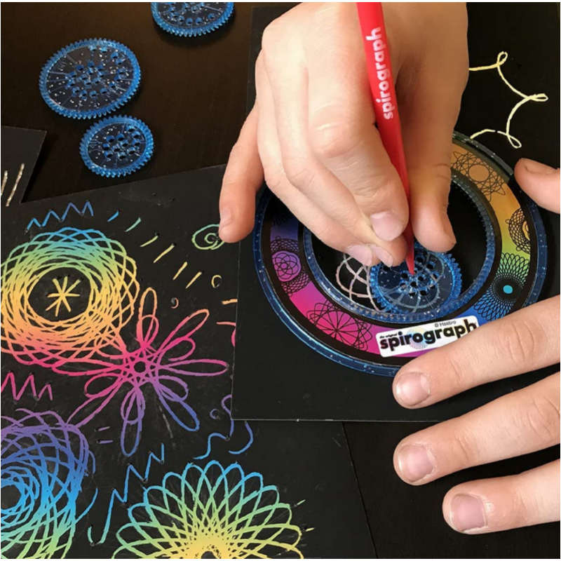 - Spirograph Scratch and Shimmer ($20.00) – Spirograph Drawing Tools make it simple for kids of all ages to create intricate, beautiful spiral art designs. This Spirograph set provides a glitter wheel and rainbow scratch paper to provide even more eye-catching fun. Get lost in the mesmirizing patterns!